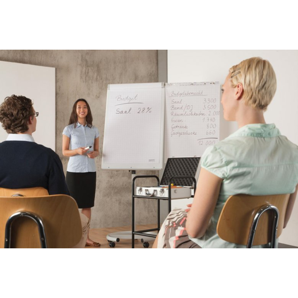 Mobilní Flipchart De Luxe s lehce stavitelnou výškou a výklopnými rameny. Součástí startovní sada příslušenství. Velmi snadná manévrovatelnost, vhodný pro prezentace, konference, výuku.