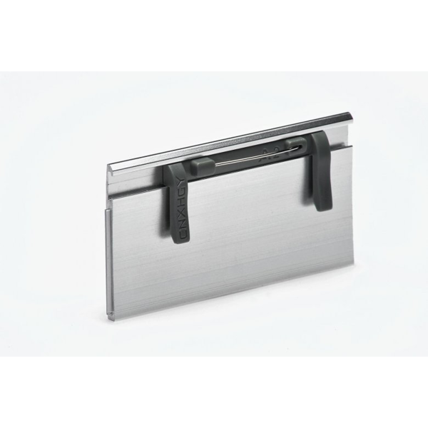 Luxusní kovová jmenovka, provedení z hliníku s matovou povrchovou úpravou. Část jmenovky určená k popisu je chráněna čirým tuhým plastem, potaženým snímatelnou fólií - tato část má rozměr 80×27 mm. Vnější rozměr celé visačky je 80x42 mm.