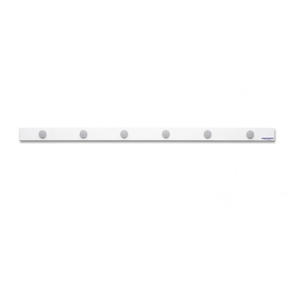 Magnetická samolepící lišta 1000x50 mm s bílým lakovaným povrchem. Součástí 6 ks magnetů Magnetoplan Discofix Standard šedá.