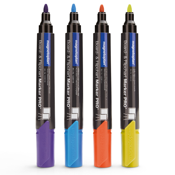 KANCELÁŘSKÁ TECHNIKA NOVÉ BARVY: Popisovač na bílé magnetické tabule nebo flipchart papír. Za sucha stíratelný. Šířka stopy 1,5 - 3 mm. Sada á 1 ks: světle modrá, fialová, žlutá, oranžová.