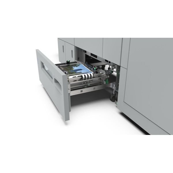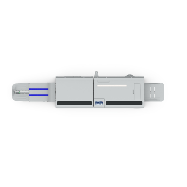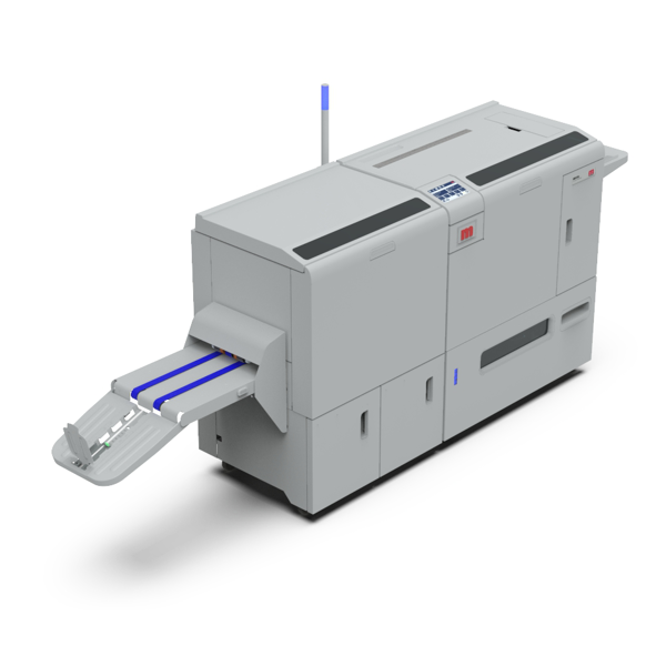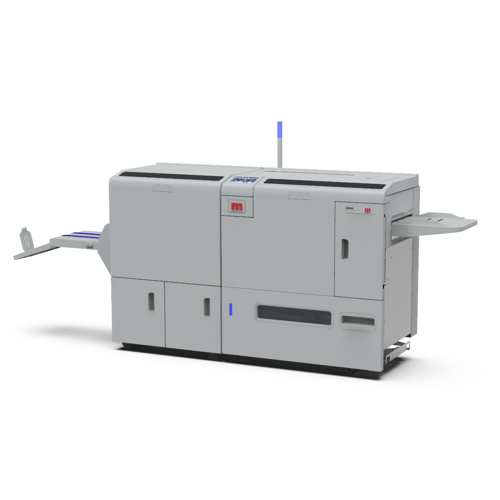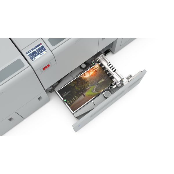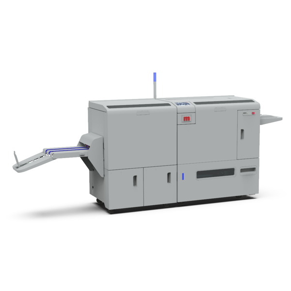 KANCELÁŘSKÁ TECHNIKA Vazba V1, dvě standardní šicí hlavy Morgana pro šití sponami z cartridge, vstupní formát A4-SRA3, prošití až 35 listů, integrovaný automatický asistenční nakladač. Kombinovaný dokončovací modul s funkcí zahranění a čelního ořezu.