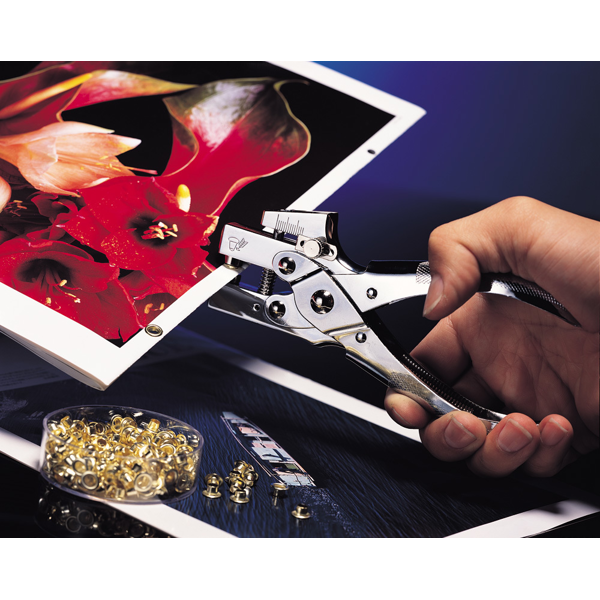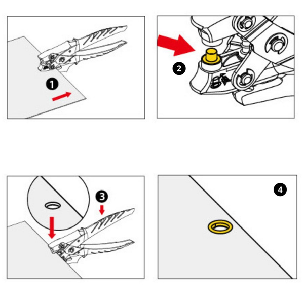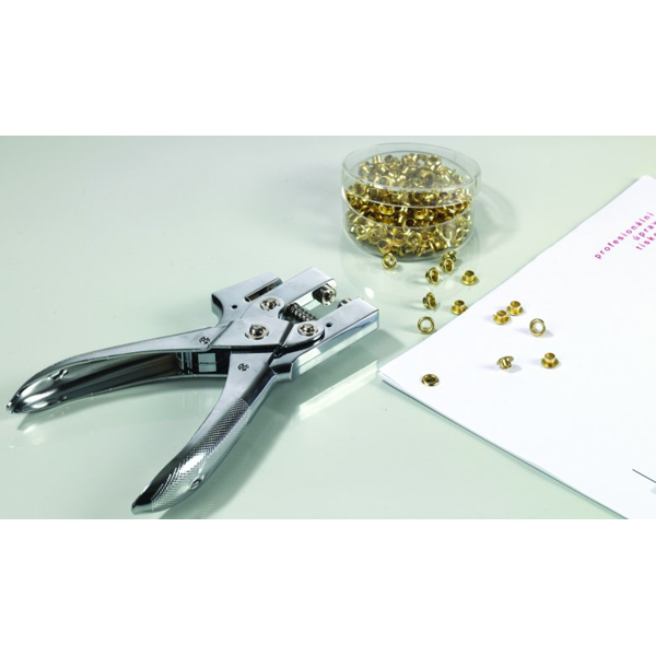 Nýtovačem nejdříve vyseknete kulatý otvor o průměru 5 mm, pak vsadíte očko a stiskem ho fixujete. Možno použít jako nerozebíratelnou vazbu dokumentů například smluv atd.