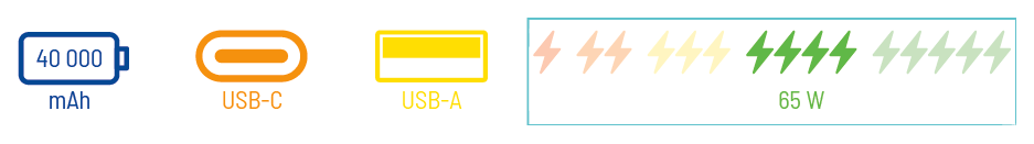 Je vybavena několika výstupními porty, včetně dvou standardních portů USB-A a dvou portů Type-C, z nichž jeden slouží k nabíjení samotné powerbanky. Porty USB nabízejí výstup 5V/4,5A, 5V/3A, 9V/2A a 12V/1,5A, zatímco port typu C nabízí výstup 5V/3A, 9V/3A, 12V/3A, 15V/3A, 20V/3,25A (PD65W), který umožňuje rychlé nabíjení různých zařízení.