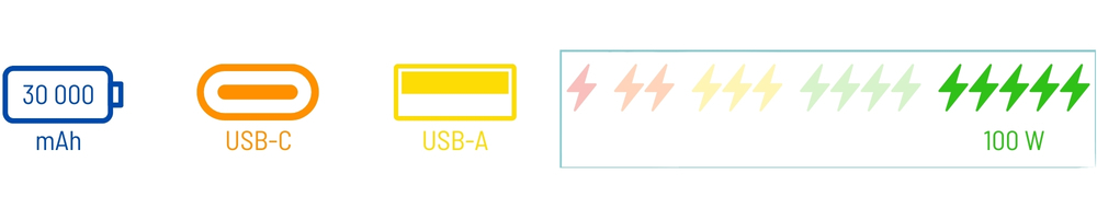 Výstupní porty USB-C1 a USB-C2 s technologií Power Delivery a další port USB-A podporující rychlé nabíjení pomocí Quick Charge zajišťují optimální nabíjení mnoha zařízení současně. Díky použití dvou USB standardů se výrazně zvýšila univerzálnost powerbanky.