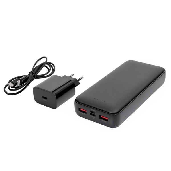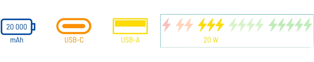 - Powerbanku o kapacitě 20000mAh s třemi porty: 1xUSB-C; 2xUSB-A , který zajistí výkon až 20W při nabíjení s technologií PD (Power Delivery).