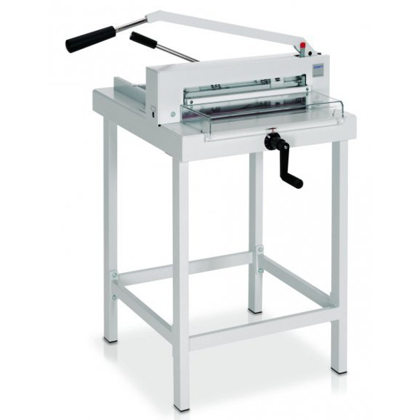 Mechanická stohová řezačka vysoce kvalitního provedení značkového výrobce EBA, řezání až do formátu A3, délka řezu 430 mm, výška stohu 40 mm, hloubka vložení stohu 435 mm.