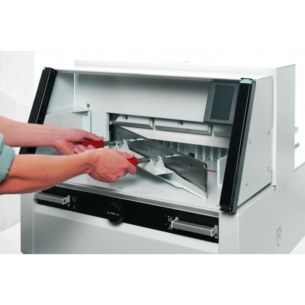 snadná a bezpečná výměna nože z přední strany bez nutnosti sundání krytů řezačky