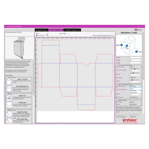 - Tento zásuvný modul umožňuje uživatelům grafického studia ColorCut Pro zapojeného do sítě vytvářet na míru šité řezné soubory ještě před návrhem tiskové grafiky. Grafik jednoduše zadá celkové rozměry D x Š x V svého obalu a zásuvný modul vypočítá rozměry a pozice záhybů, rýh, záložek a chlopní. Takto připravenou šablonu je možné následně exportovat přímo do prostředí Adobe® Illustrator® nebo CorelDRAW® pro přidání finální vrstvy s tiskovou grafikou.