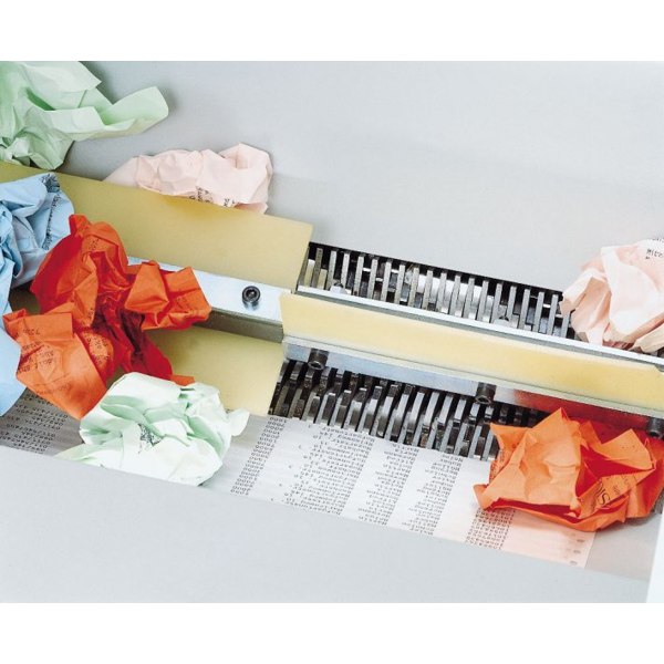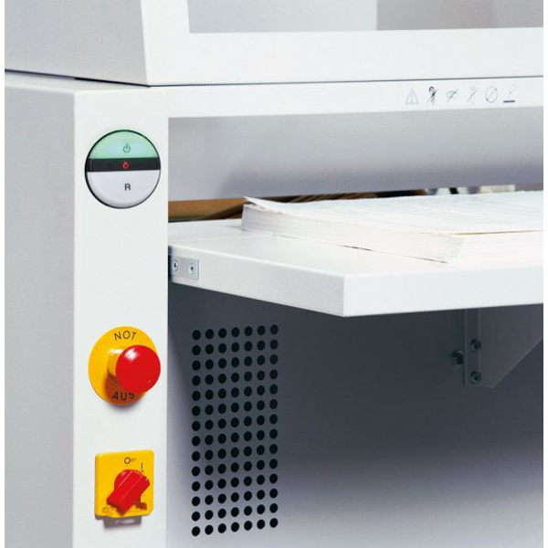 Vstup rovného papíru ke skartovací jednotce přes 460 mm širokou nakládací stěrbinu, před ní sklopitelný nakládací stůl. Elektronické, automatické spuštění reverzního chodu nebo úplné odstavení chodu při přeplnění nebo přetížení.