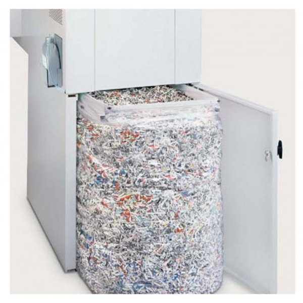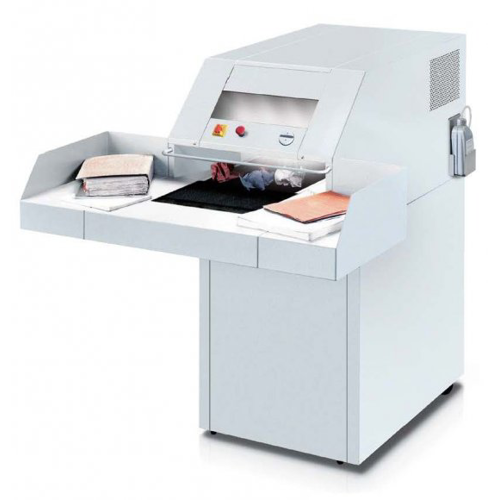 Velkokapacitní skartovač s pásovým dopravníkem, skartace na pásky šíře 6 mm. Schopnost skartace vedle papíru: plastové karty, CD/DVD, diskety.