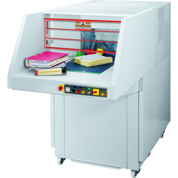KANCELÁŘSKÁ TECHNIKA Vstupní šířka 500 mm, prostorný stůl pro vstup skartovaného materiálu s dopravním pásem, pohyblivá bezpečnostní mříž v pracovním prostoru s elektrickým bezpečnostním vypínačem. Optické ukazatele provozu. Kapacita odpadního koše 300 litrů. Rozměry stroje jsou 1036 x 2170 x 1714 mm.
