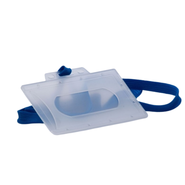 KANCELÁŘSKÁ TECHNIKA Tuhá plastová visačka pro kreditní karty s modrou sňůrkou na krk - vodorovná, provedení z průhledného polomatného plastu. Jedna strana s oválným otvorem pro snadné vsunutí karty. Výhodou visačky je poměrně velký výsek 24x57 mm pro snadné čtení kódu, má zaoblené hrany. Úchyt s výsekem pro zavěšení 15x3 mm není součástí visačky, ale vystupuje z ní. Šířka šňůrky 9 mm, délka šňůrky 450 mm. Vnější velikost: výška 60 mm x šířka 93 mm x hloubka 3 mm.