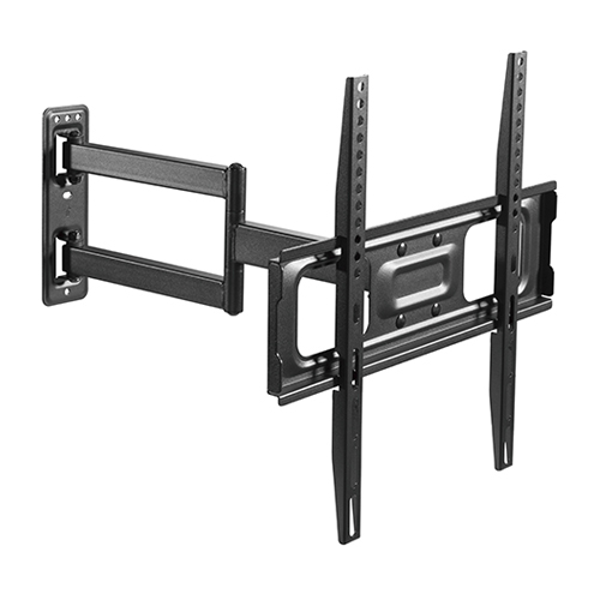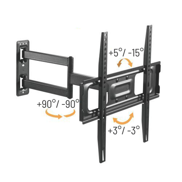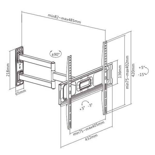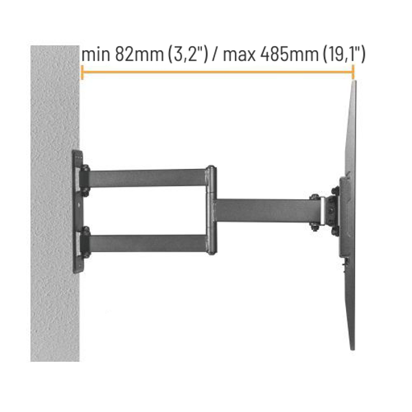 KANCELÁŘSKÁ TECHNIKA Výsuvný nástěnný držák LPA69-443 je určen pro instalaci TV s plochou obrazovkou s úhlopříčkami od 32“ do 55“. Jeho největší přednostní je robustní výsuvná konstrukce, díky níž unese TV o hmotnosti až 35 kg a zároveň umožňuje nastavit vzdálenost TV od stěny v rozsahu 82 mm až 485 mm, samozřejmostí je pak také velký rozsah polohování. Držák umožňuje snadné naklápění TV v rozsahu +5°~-15°, natočení do stran v rozsahu +90°~-90° a rotaci v rozsahu +3°~-3°, což maximalizuje flexibilitu sledování z libovolného místa v místnosti. Integrovaná svorka na kabely udržuje kabely uspořádané a chráněné.